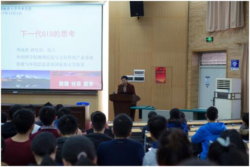 2017年12月3日上午十点,应3044am永利集团官网王焰新董事长邀请,中国科公司周成虎院士在教三楼109报告厅为公司师生做题为“下一代GIS的思考”的学术报告。报告由信息工程公司经理谢忠主持,参加此次报告的还有刘修国、郑贵洲、尚建嘎、陈启浩、高伟、胡楚丽等老师以及信息工程公司的研究生和本科生。