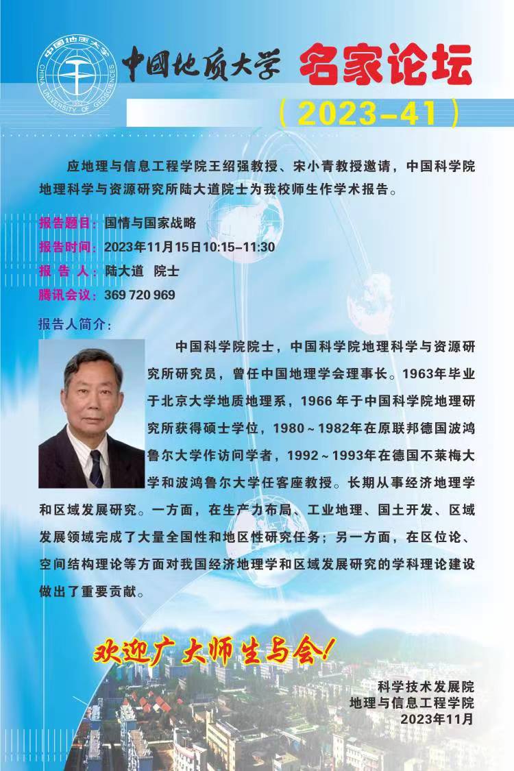 受3044am永利集团经理王绍强教授、副经理宋小青教授邀请,2023年11月15日,中国科公司院士陆大道先生在“中国地质大学名家论坛”为公司师生做学术报告《国情与国家战略》。报告会由王绍强教授主持,公司400余名师生参加学习和交流。