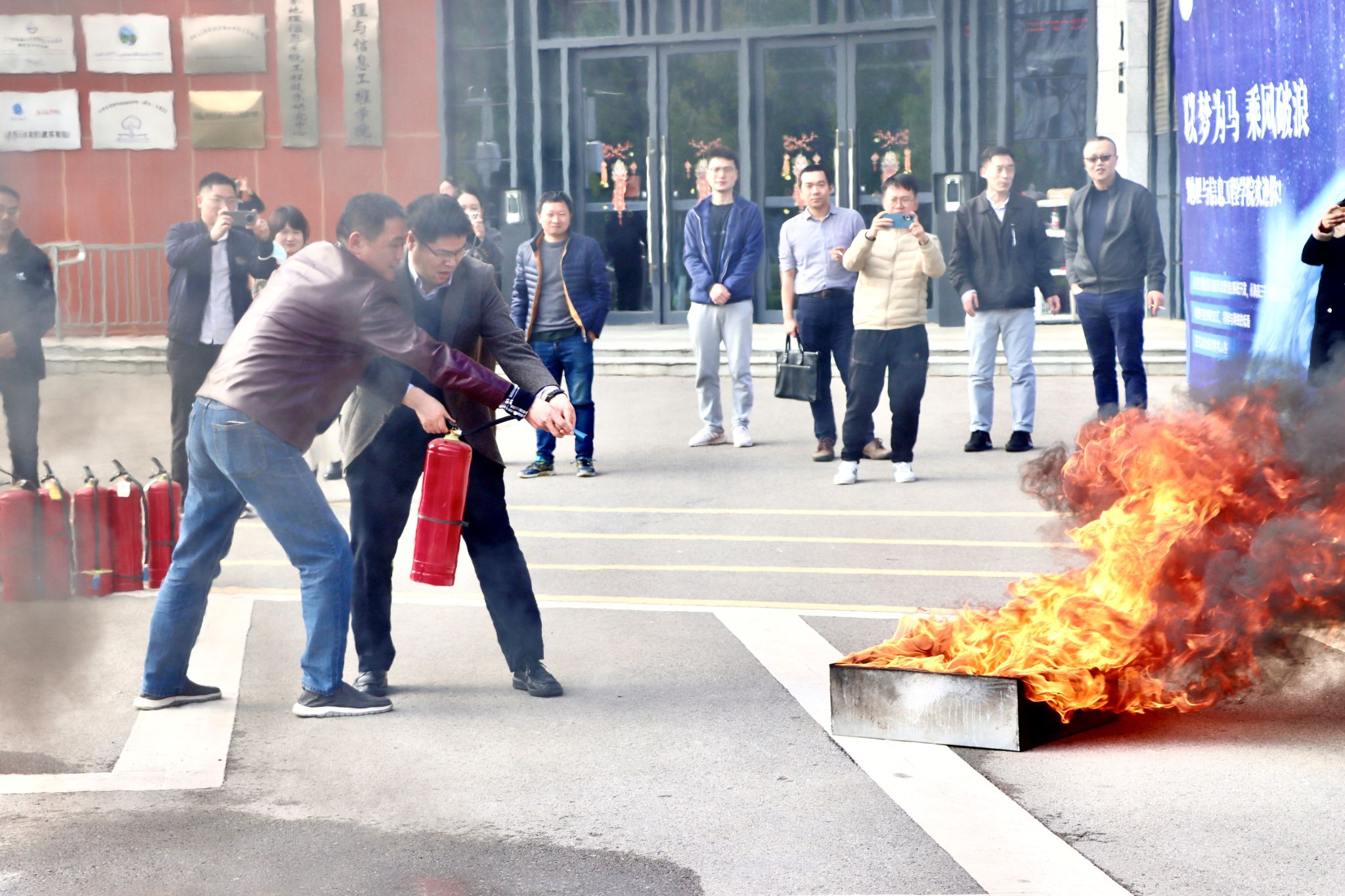 会议最后,公司安全保卫部科长张献文为全院教职工作安全教育主题讲座。参会师生在公司楼前开展消防实战演练。