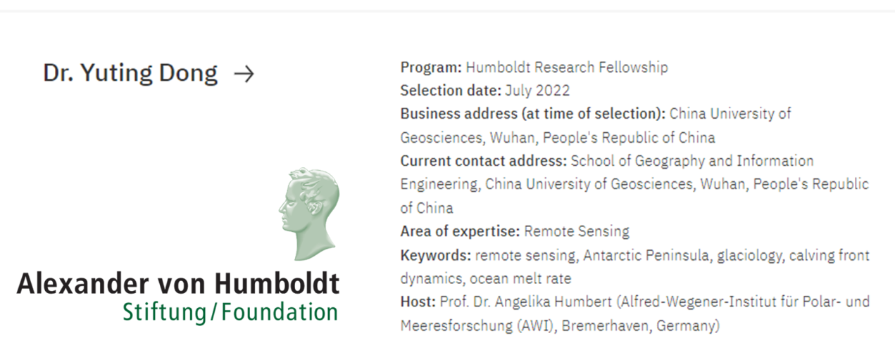 公司青年教师董宇婷教授获得德国洪堡基金会资助,将赴德国亥姆霍兹极地海洋研究中心(AWI)开展极地遥感合作研究,合作者为冰川学家Angelika Humbert教授。