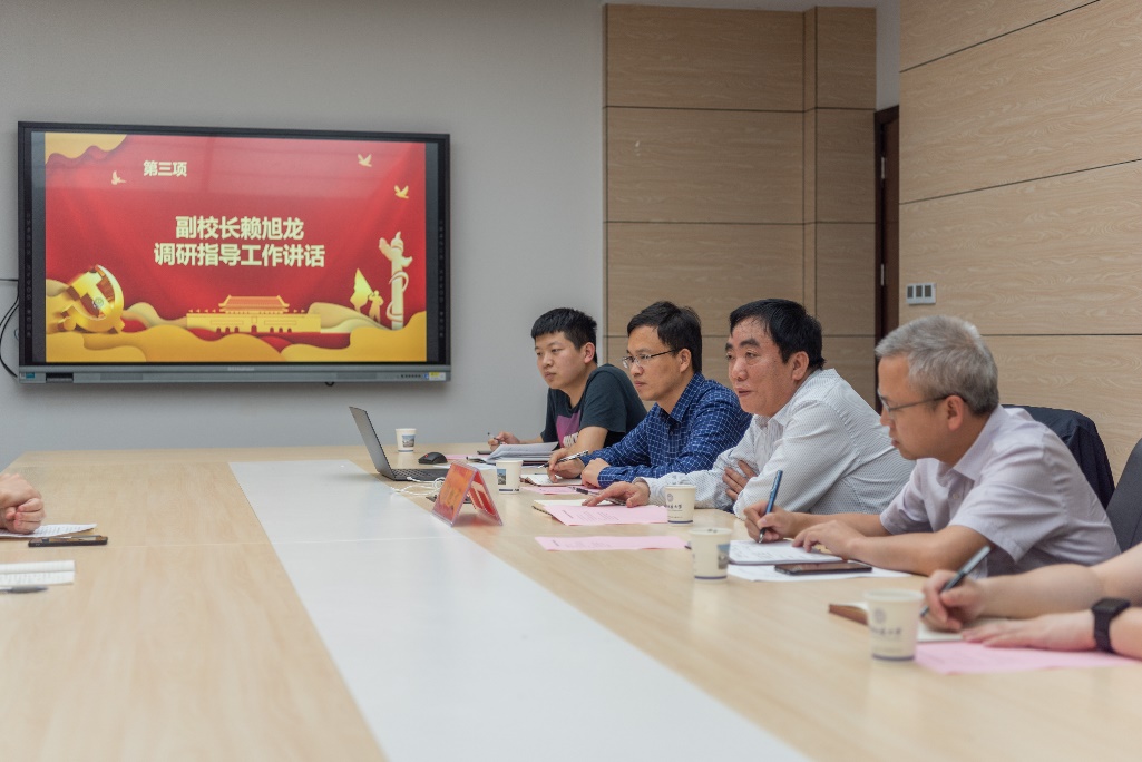 赖旭龙同师生交流并作老员工思想政治教育工作指导讲话。他同员工代表亲切交谈,询问员工日常学习生活当中所遇到的困难和问题,并认真聆听并一一做记录。他特别询问了员工党员发展工作情况。武彦斌作了简要汇报,并表示上级党组织部署的工作任务正在顺利推进。