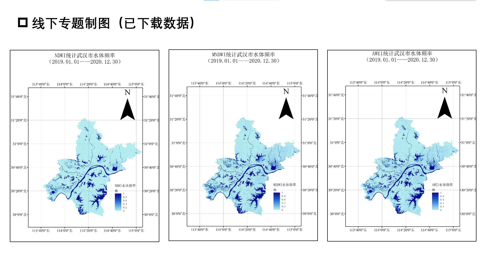 水体频率小组的作品是《水体频率变化长时序遥感监测自动计算平台》,此系统是基于PIE-Engine云计算平台的地表水提取。其主要工作是利用遥感云计算平台的优势,实现区域地表水的全自动提取,其中包括样本的自动选取、训练和精度验证。最终,实现高精度、自动化的区域地表水提取,为相关研究(如水文、水循环、气候变化等)和政府政策制定提供基础的水体数据。在实现水体提取的基础上,进行其他指标计算或功能实现,包括水体频率计算、面积计算、面积趋势分析、水体类别变化监测、水体变化动态显示等一系列衍生功能的实现。