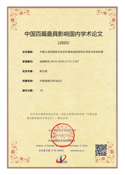 近日,公司陈万旭副教授等撰写的论文《中国土地利用变化生态环境效应的空间分异性与形成机理》获得来自中国科学技术信息研究所颁发的《中国百篇最具影响国内学术论文(2020)》证书,这是国内期刊论文的最高荣誉。