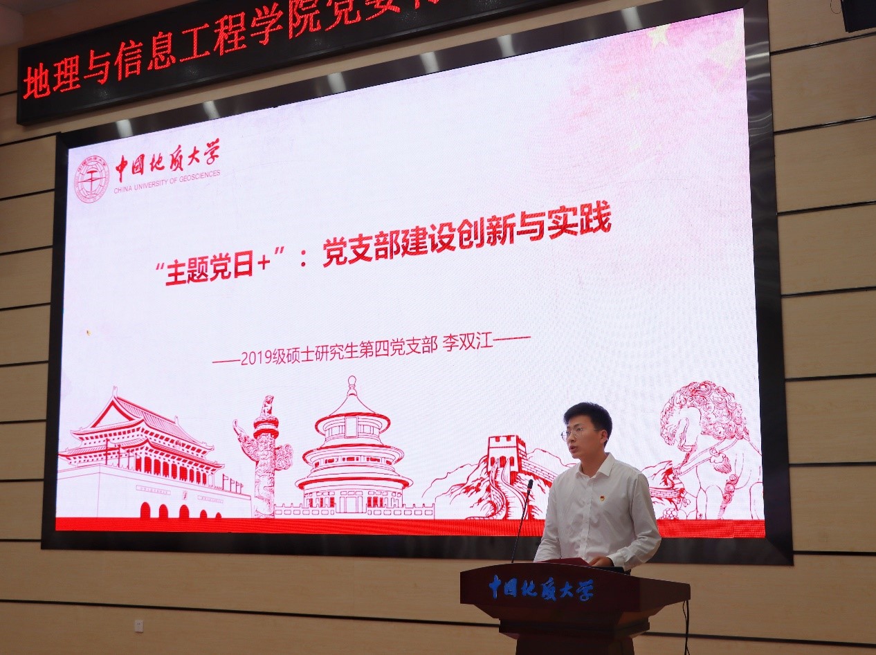 公司2019级硕士研究生第四党支部书记李双江以“主题党日+:党支部建设创新与实践”一题做分享,从支部思想建设,创新形式等方面做经验交流。