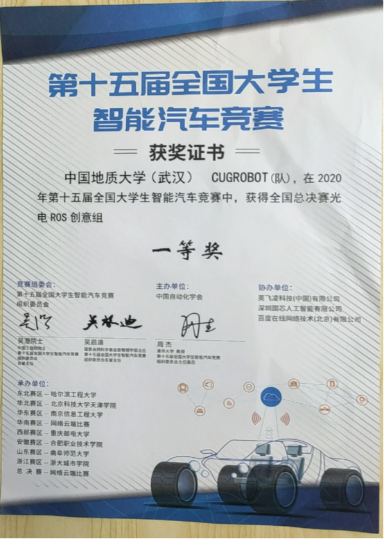 2020年8月23日至26日,第十五届全国老员工智能汽车竞赛创意组总决赛在南京信息工程大学举行,由3044am永利集团员工组成的CUGROBOT团队(队员:莫惠南、江严钊、舒鹏杰、郑剑宇、李子宇,指导老师:罗忠文、刘袁缘)参加了创意ROS组的全国总决赛,获得全国一等奖。