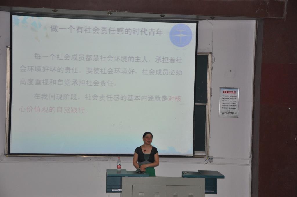 公司党委书记黄菊老师讲课,黄老师首先引用了习近平今年五四青年节在北京大学师生座谈会上的讲话“时间之河川流不息,每一代青年都有自己的际遇和机缘,都要在自己所处的时代条件下谋划人生、创造历史。”进而对全体毕业生指出,当代青年的历史责任,是做一个有社会责任感的时代青年。黄老师说,青年的价值取向决定了未来整个社会的价值取向,所以,同学们应该在将来的社会生活中主动践行社会主义核心价值观。青年践行社会主义核心价值观的过程,是励志的过程、修德的过程,也是更好地实现自己人生价值的过程。黄老师给大家详细地介绍了社会主义核心价值观的内涵,从公民层面的价值要求出发,告诉同学们要爱国、敬业、诚信、友善。具体的践行方式是勤学、修德、明辨、笃实。最后,黄老师用温家宝员工在2012年5月19日回母校时的讲话结束,希望全体毕业生铭记“母校培养了我,我要用我自己工作的成绩来报答母校,决不辜负母校对我的期望。”
